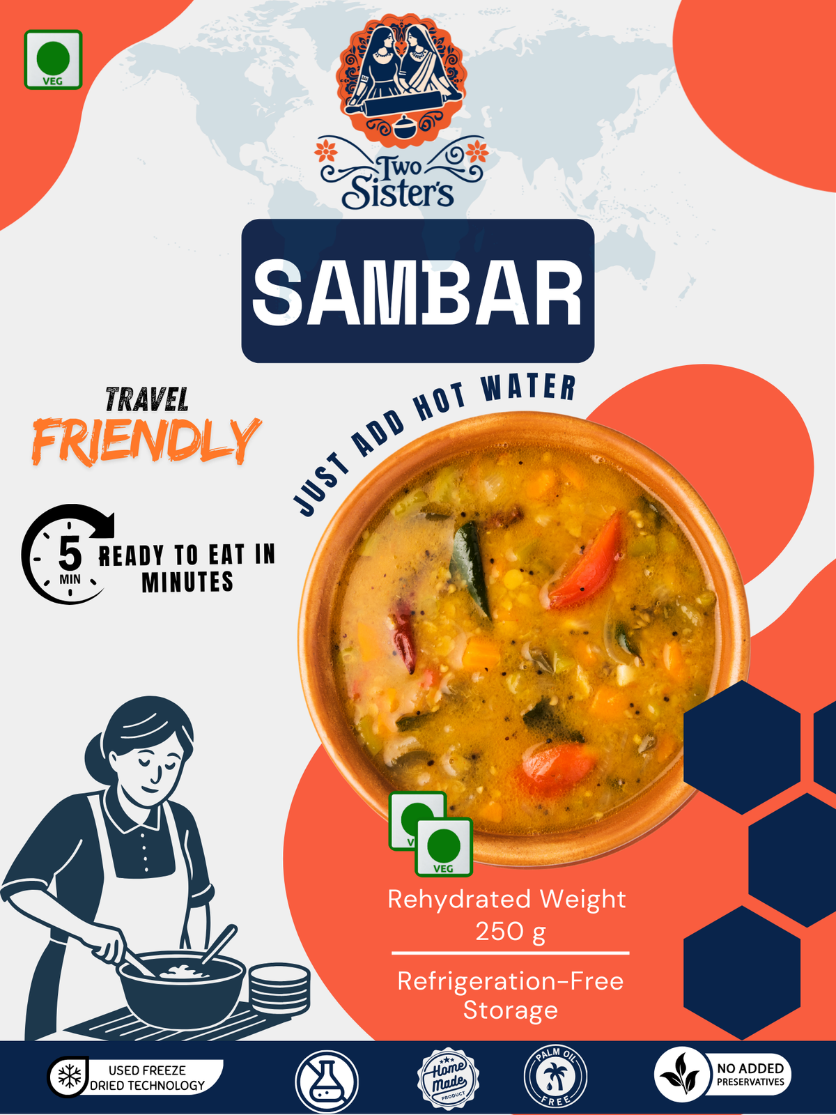 No, we don’t use any preservatives in our meals. Instead, we rely on freeze-drying, a modern preservation method that removes moisture without using heat. This gentle process keeps the food naturally shelf-stable while protecting the real flavours, nutrients, and textures — as if it were freshly made. It’s the same technology used in mountain expedition meals, where people rely on real, nourishing food that can travel light and stay fresh — even without a fridge. Because our meals are already cooked and then freeze-dried, there's no need for additives, artificial ingredients, or shelf-life extenders. What you get is real, honest food that’s just as comforting as a home-cooked meal — only faster and easier.